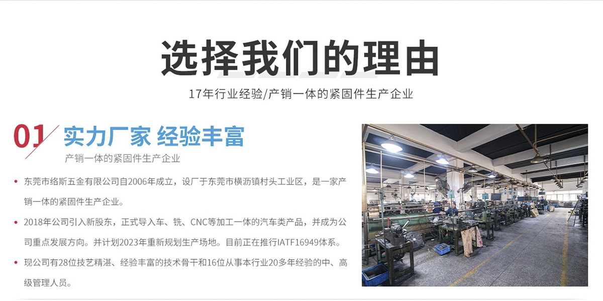 東莞市絡斯五金有限公司自2006年成立,設廠于東莞市橫瀝鎮(zhèn)村頭工業(yè)區(qū),是一家產(chǎn)銷一體的專業(yè)緊固件生產(chǎn)企業(yè)。