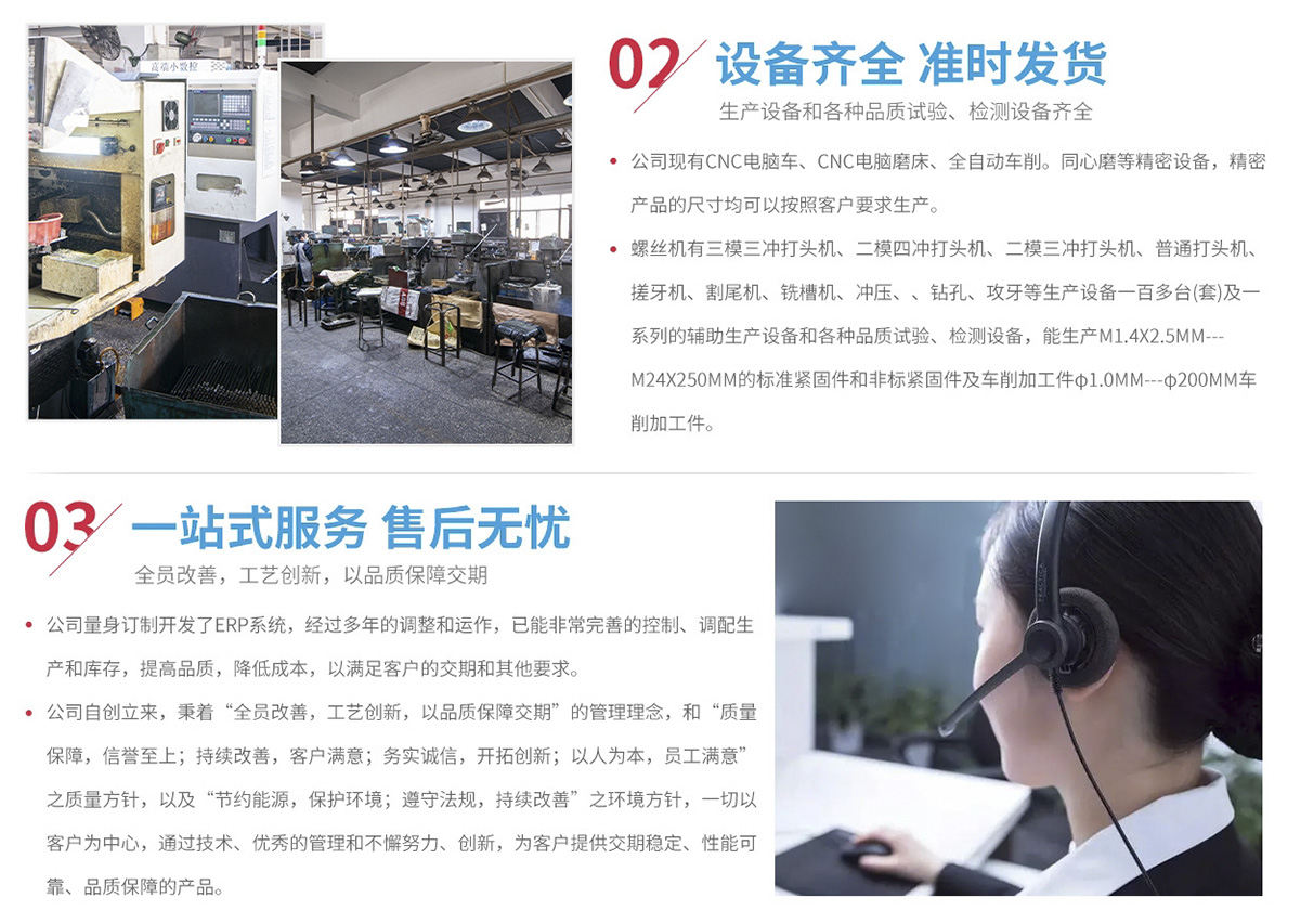 主要生產(chǎn)非標件(止付螺絲、自攻牙螺絲、木牙螺絲、機械牙螺絲、加長螺絲、高強度螺絲、螺桿、軸、銷等)和標準件(國標、美標、德標、日標、英標等)。